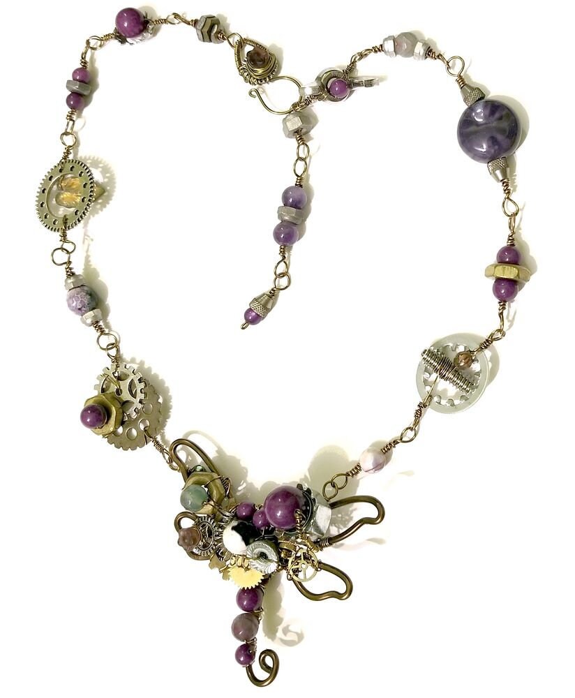 Steampunk Dragonfly Necklace in Purple with Vintage and Recycled Materials and Real Hardware, Adjustable Length